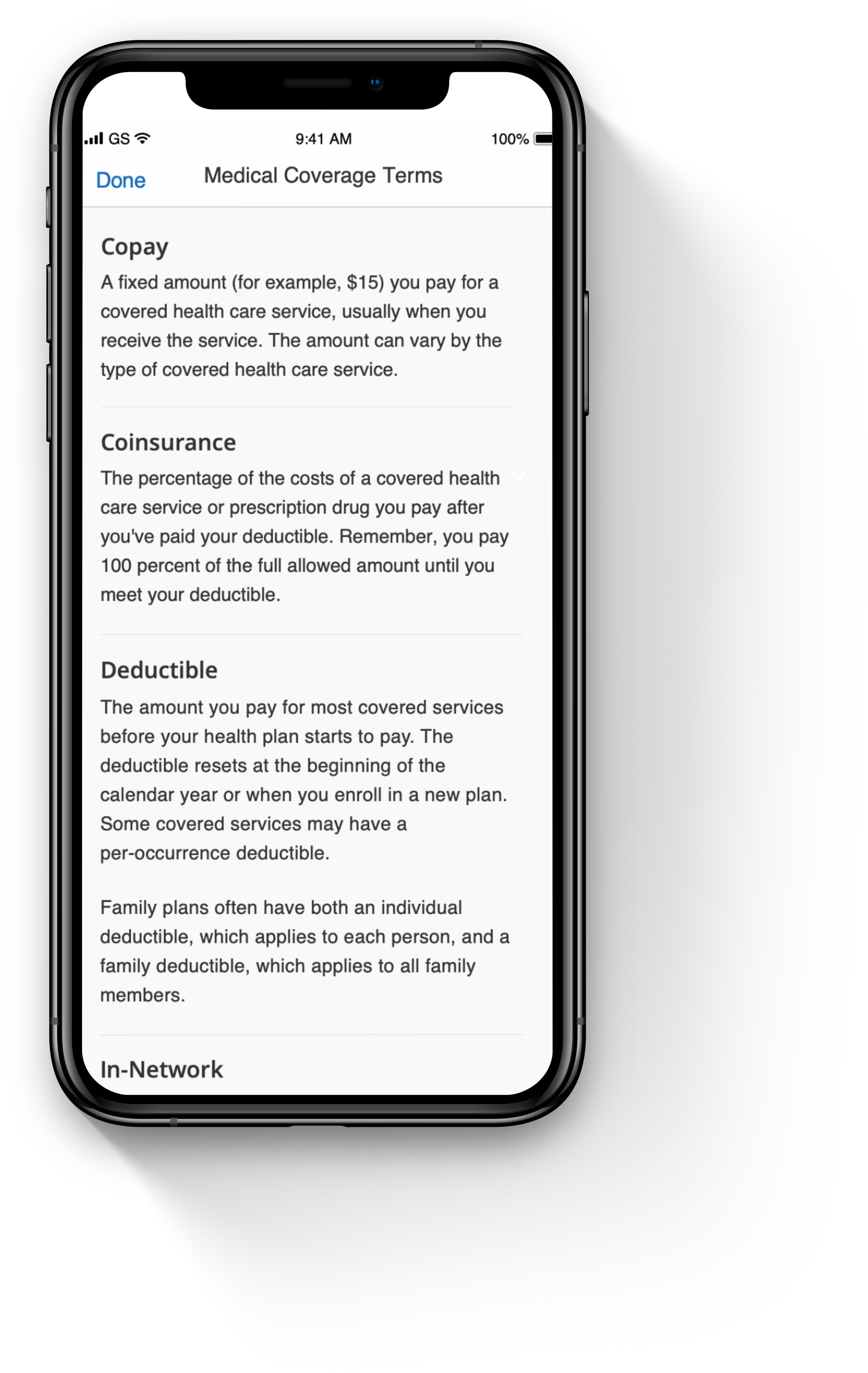 My favorite addition to the app. We heard how confused users were with insurance terms, so we made definitions. Insurance is a confusing subject and we decided to use a simple dictionary method to help.